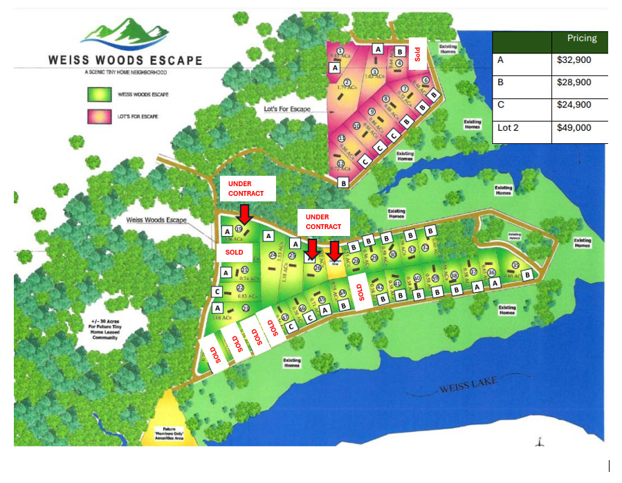 Weiss Woods Escape is made up of 30 lots that range in size from 0.56AC-1.53AC. These are located off County Road 212 and each lot has its own road frontage. Many of these lots have beautiful views of the cotton fields across the road and some have views of the lake in front. They are flat and wooded which provides more privacy and allows you the ability to get more use out of the property. Weiss Woods Escape will be restricted to tiny homes only and must be purchased from us here at River Ridge Escapes. ***NO HOA FEES & NO RENTAL RESTRICTIONS***