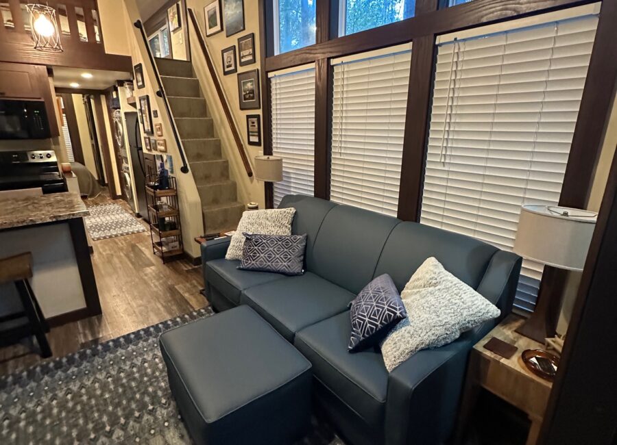 The sleeping area is cozy and private, with natural light and custom details that give the space a relaxed, cabin-like feel. A loft adds additional flexible space for sleeping, storage, or a creative retreat. The bathroom is efficiently designed with modern fixtures and a clean, polished look.